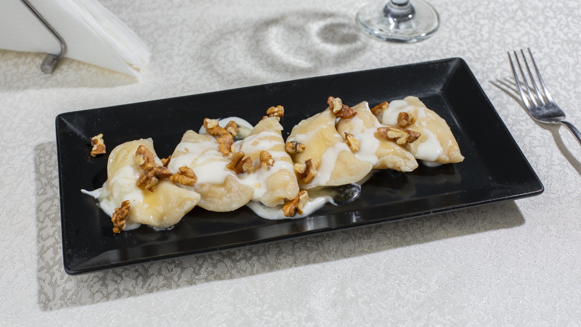 Colțunași cu brânză dulce, smântână și sos de miere cu nuci