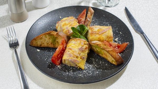 3 ouă, roșii, șuncă, cașcaval, pâine prăjită