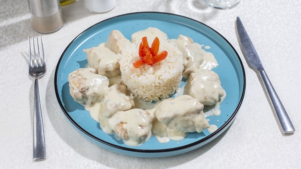 Piept de pui, sos gorgonzola, cartofi gratinați