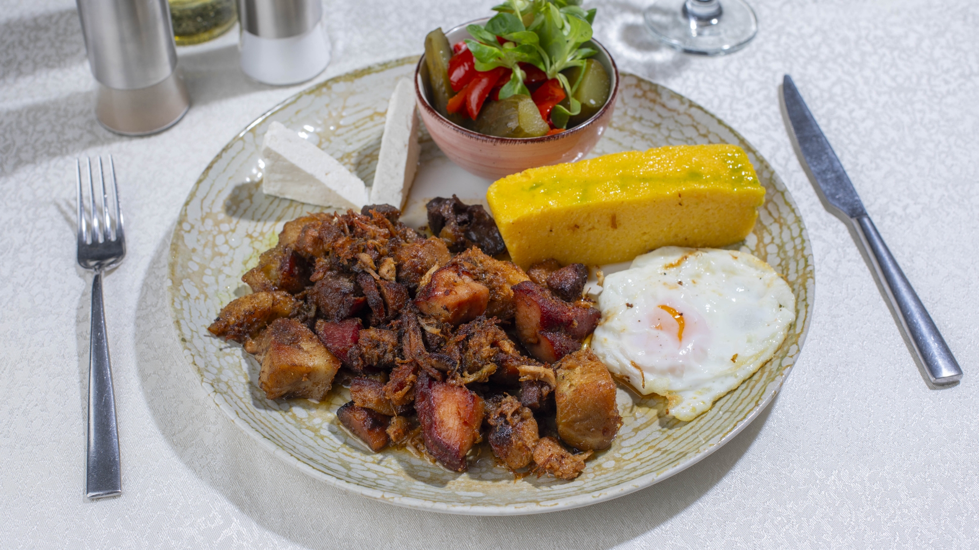 Carne de purcel, cârnați de casă, piept de porc, brânză de burduf, 1 ou ochi, murături, mămăligă